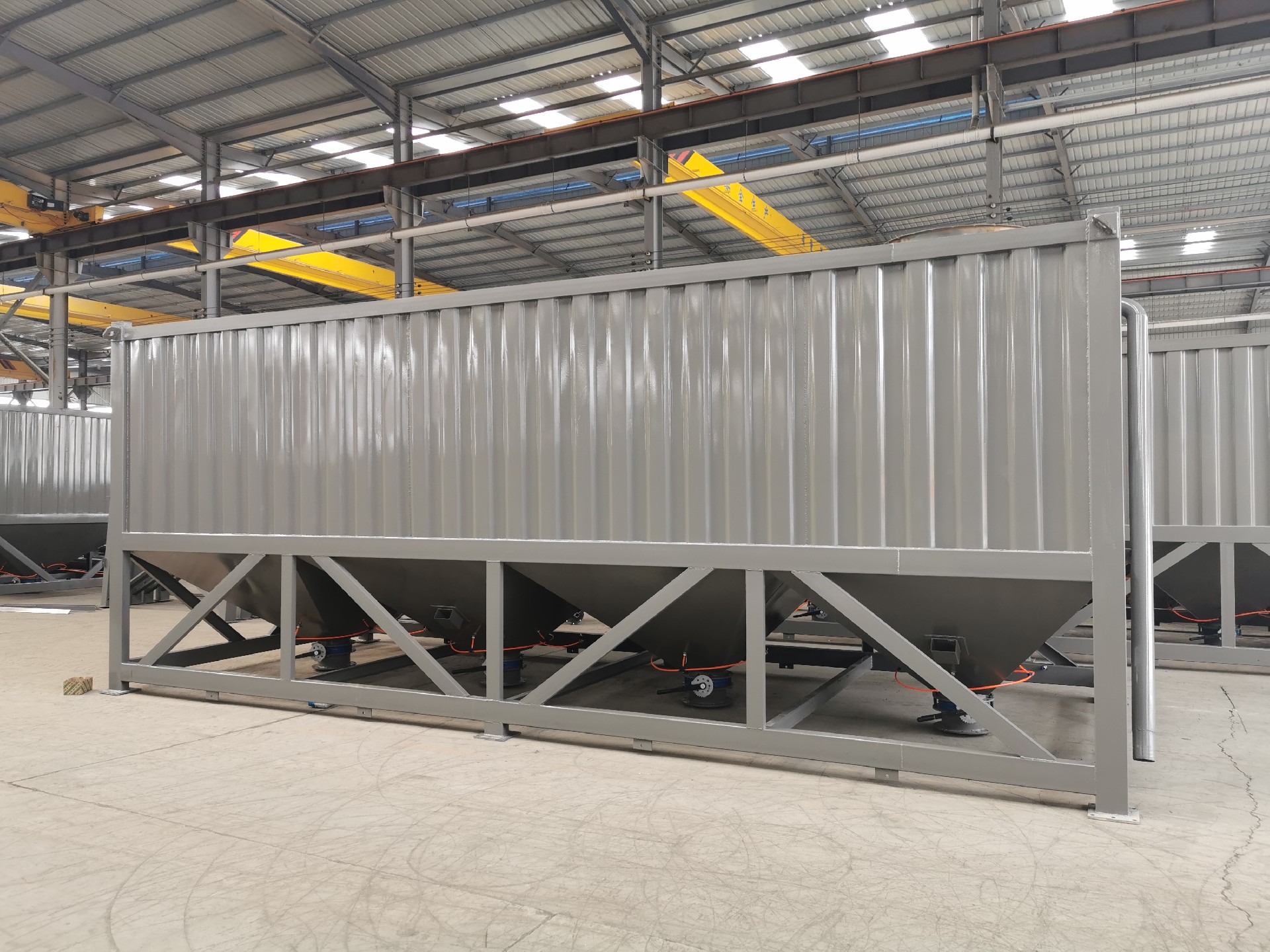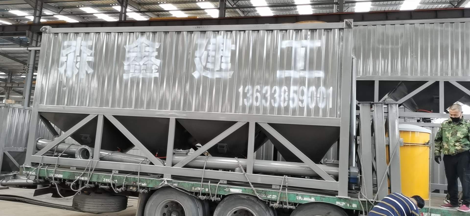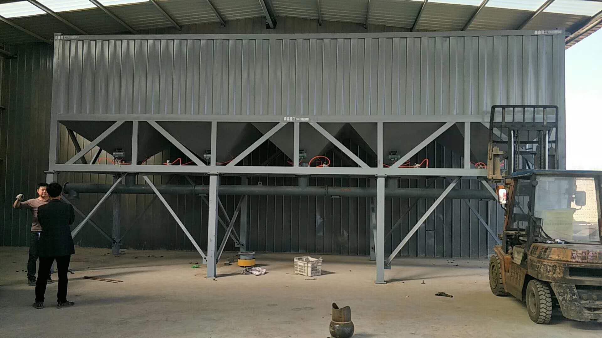 臥式水泥倉為方形,底部由數(shù)條支腿支撐,出料錐體為方形錐體,倉體為瓦楞板和型材組成的框架焊接而成,整體高度偏低。臥式水泥倉在底部設(shè)有水泥卸料口和螺旋輸送機(jī),可方便的進(jìn)行卸料和輸送。和傳統(tǒng)立式水泥倉相比,臥式水泥倉對地基要求低,可直接立放于地面,可方便的使用卡車或平板車運(yùn)輸而無須拆卸。臥式水泥倉,常見2斗,4斗,6都等,常見規(guī)格30噸,50噸,80噸,100噸等,可以根據(jù)客戶要求定制。